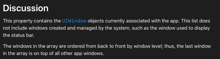 UIApplication.shared.windows μμ±μμλ μμ€ν μ΄ λ§λ μλμ°λ₯Ό νμΈν μ μλ€λ κ²μ μκ² λμμ΅λλ€.