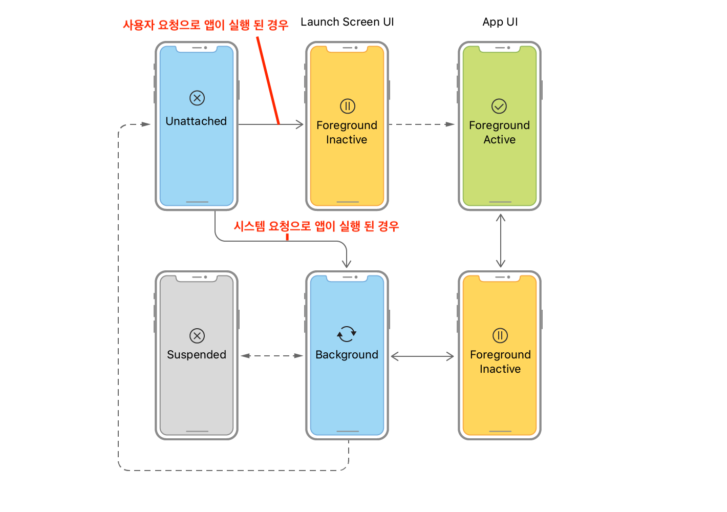 iOS12 μ΄ν λ²μ , κ·Έλ¦¬κ³ Scene μ μ§μνμ§ μλ μ±μ ν΄λΉνλ μλͺ μ£ΌκΈ° μ λλ€. (App-Based Life-Cycle)